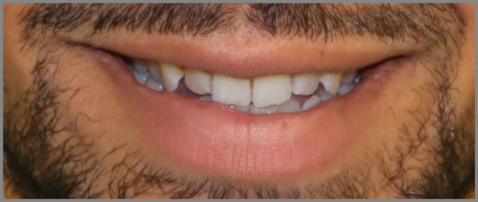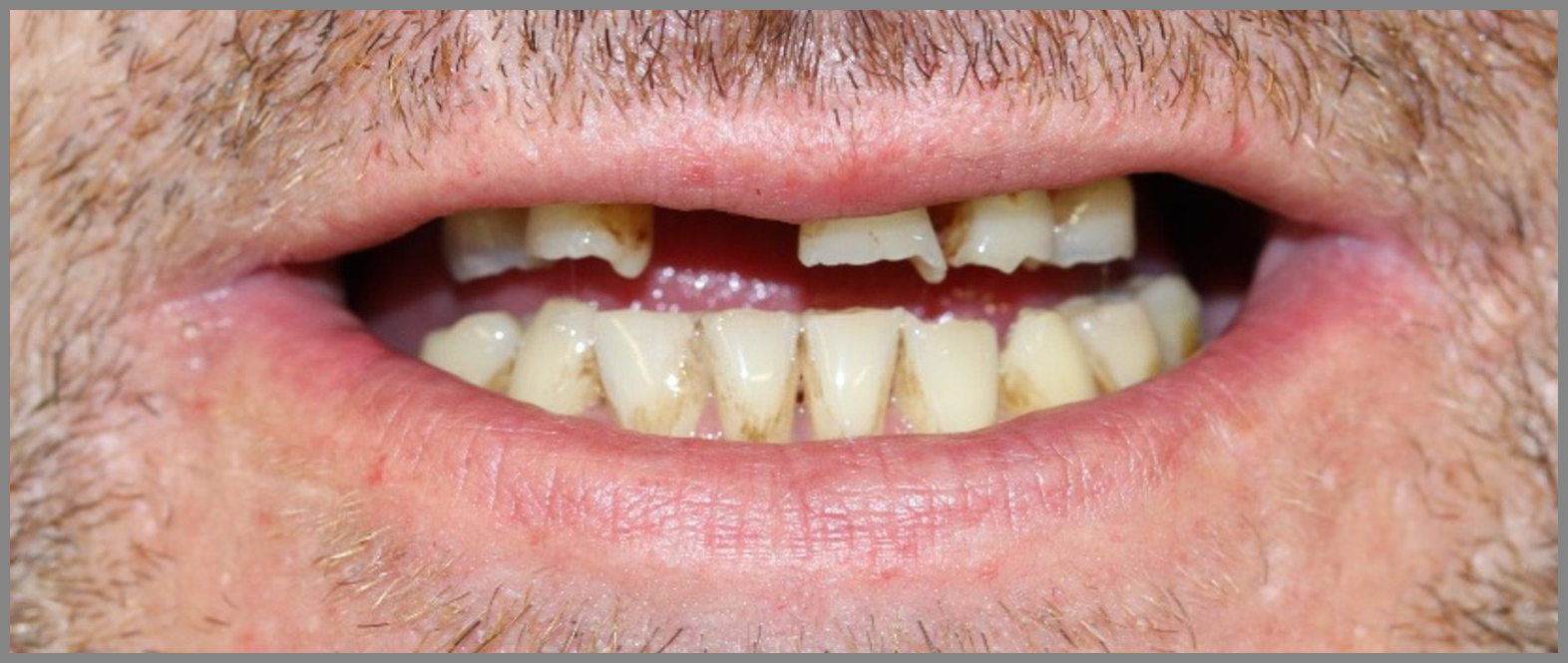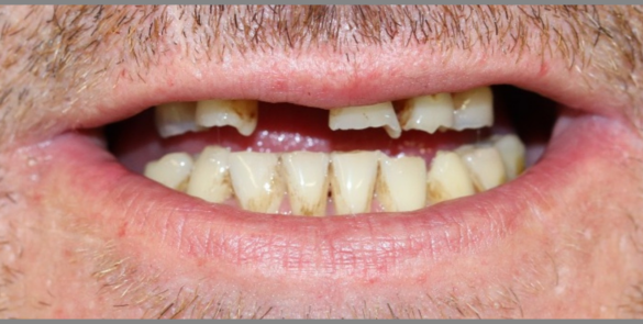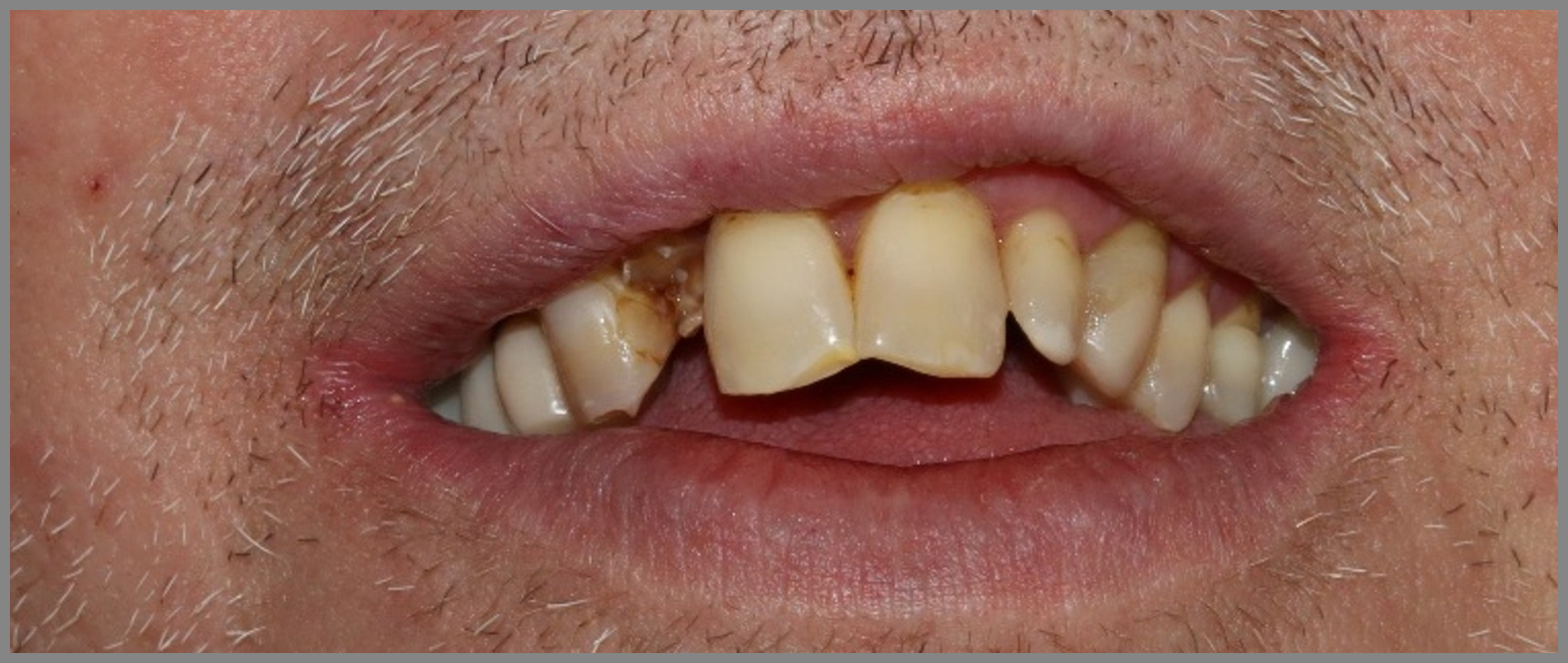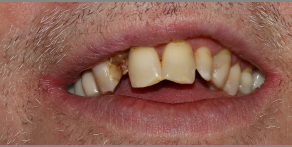 Stark beschädigte und verfärbte Zähne. Nachher: Die Vollkeramik Kronen gaben dem Patienten ein neues, strahlendes Lächeln zurück.
