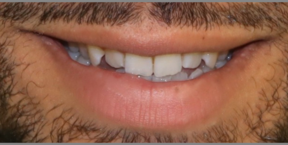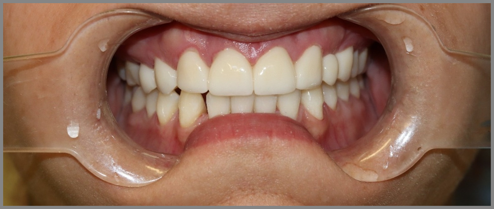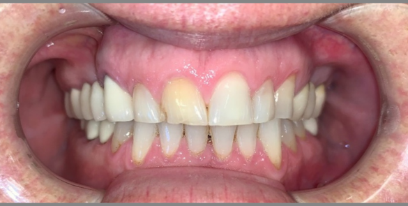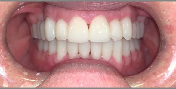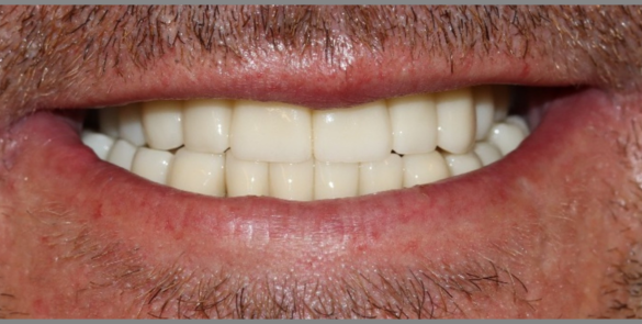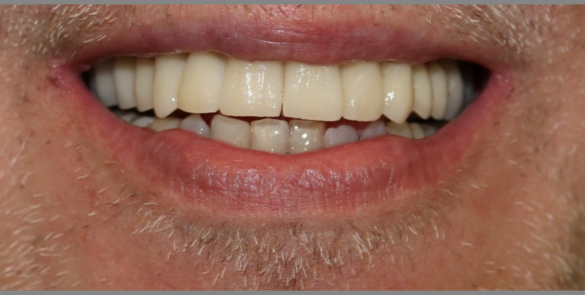 Der Patient hatte stark abgenutzte Zähne mit mehreren Verfärbungen. Nachher: Mit 18 neuen Keramikkronen konnte der Patient ein strahlendes Lächeln und eine verbesserte Kauffunktion genießen